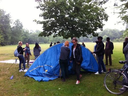 “Het was een lange, zware en emotionele dag”, aldus een sfeerbeschrijving van een ondersteuner. “Het vertrek uit de Vluchthaven, de lange tocht door de stad en het neerstrijken in het Oosterpark, waar een tentenkamp werd opgezet. Herinneringen aan de eerste tentenkampen twee jaar geleden. Rond half tien raakte alles in een stroomversnelling. De ene na de andere buurtbewoner kwam langs met dekens en eten. De moslims van de groep bereidden zich voor op het breken van hun vast. Het KNMI kondigde een weerswaarschuwing aan en iedereen maakte zich op voor een fikse bui.”